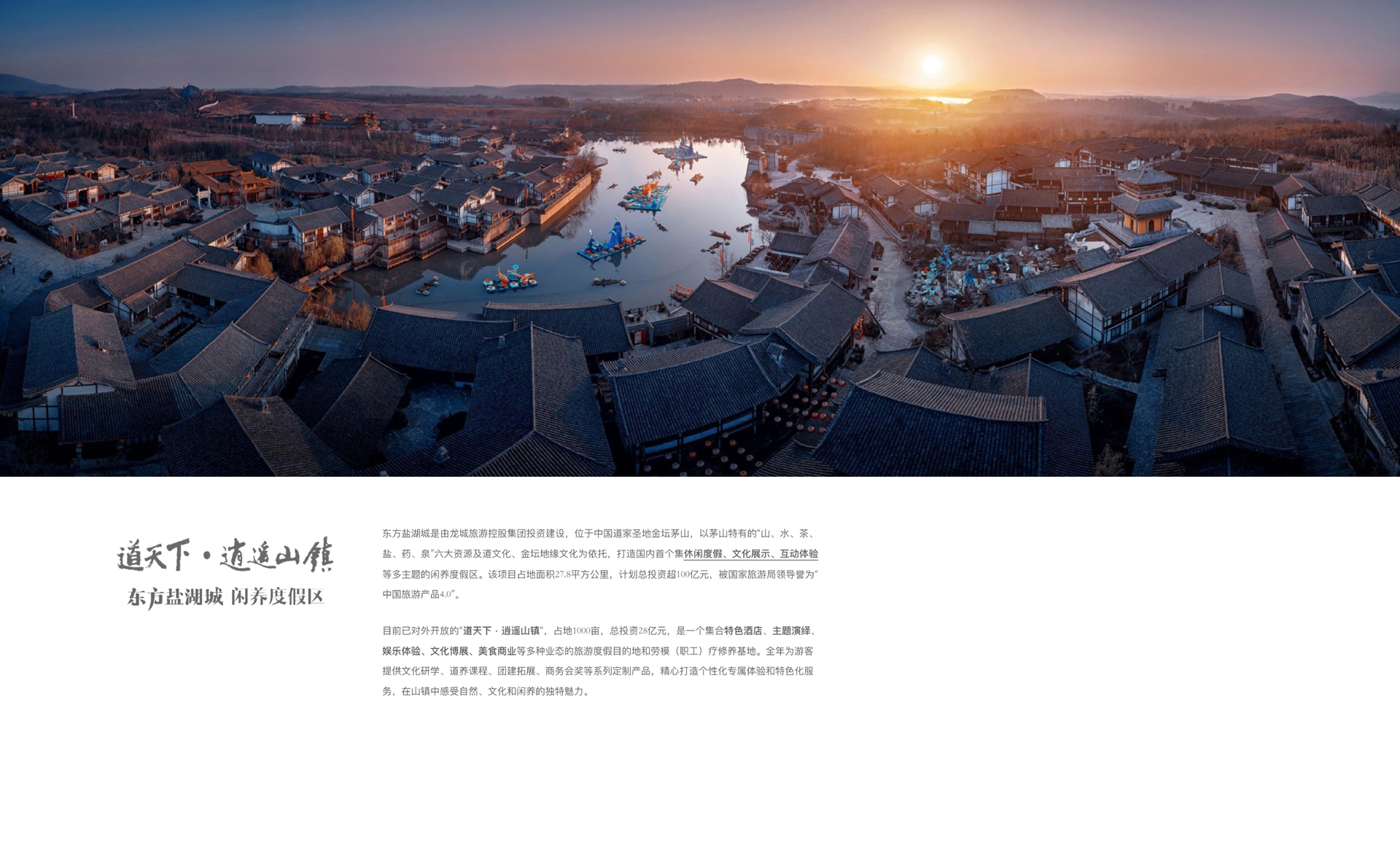 東方鹽湖城是由龍城旅游控股集團投資建設,位于中國道家圣地金壇茅山,以茅山特有的“山、水、茶、 鹽、藥、泉”六大資源及道文化為依托,打造國內首個集休閑度假、文化展示、互動體驗 等多主題的閑養度假區。對外開放的“道天下·逍遙山鎮“,占地1000畝,是一個集合特色酒店、主題演繹、 娛樂體驗、文化博展、美食商業等多種業態的旅游度假目的地和勞模(職工)療修養基地。為爭創5A級景區并解決景區原有導視系統功能不足等問題,東方鹽湖城旅游發展公司啟動了道天下景區導視系統設計的工作。